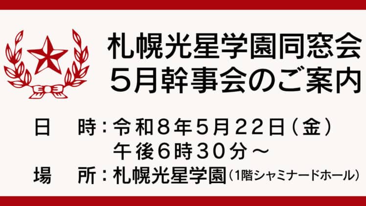 各期幹事各位札幌光星学園同窓会会長 中田 隆博5月幹事会開催のご案内拝啓 少しずつ春らしくなってきましたが、各期幹事の皆様、いかがお過ごしでしょうか。さて、下記の通り幹事会を開催致しますので、万障お繰り合わせの上ご参加下さいます様、お願い...