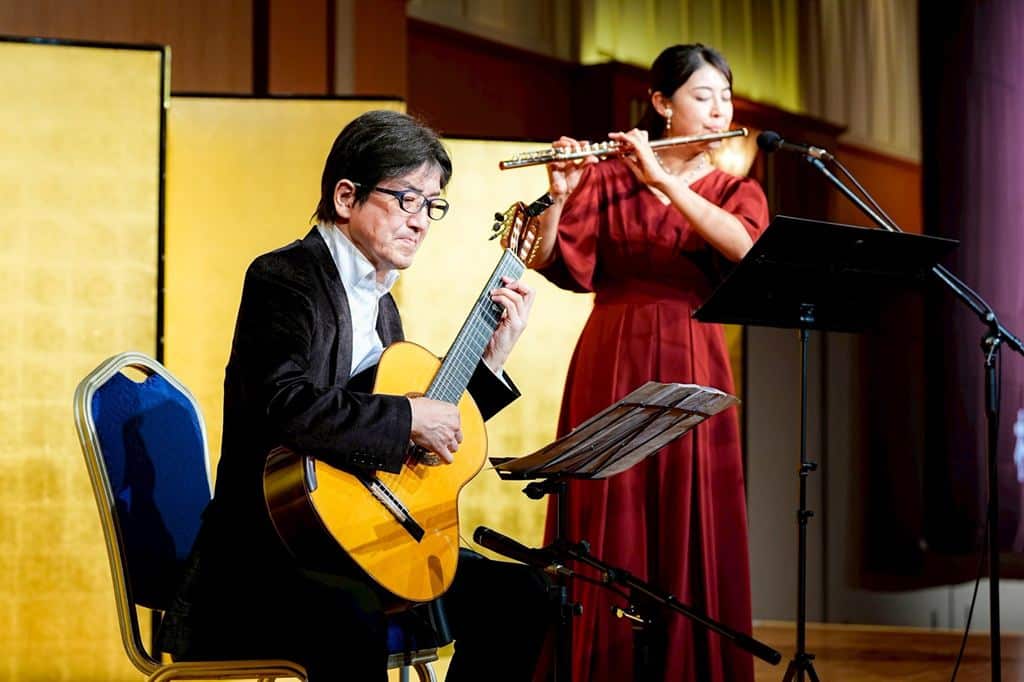 その後、58期の企画による盛大に懇親会が行われ、スタートは、84期卒の上村幸矢さん作成のオープニングムービーで幕が開けました。しばしの歓談の後、43期卒のプロギタリスト佐藤洋美さんとフルート演奏家の大島さゆりさんとの演奏が行われ、クラシックギターとフルートの音色が会場に響き渡りました。また恒例の抽選会が行われ、盛り上がりました。